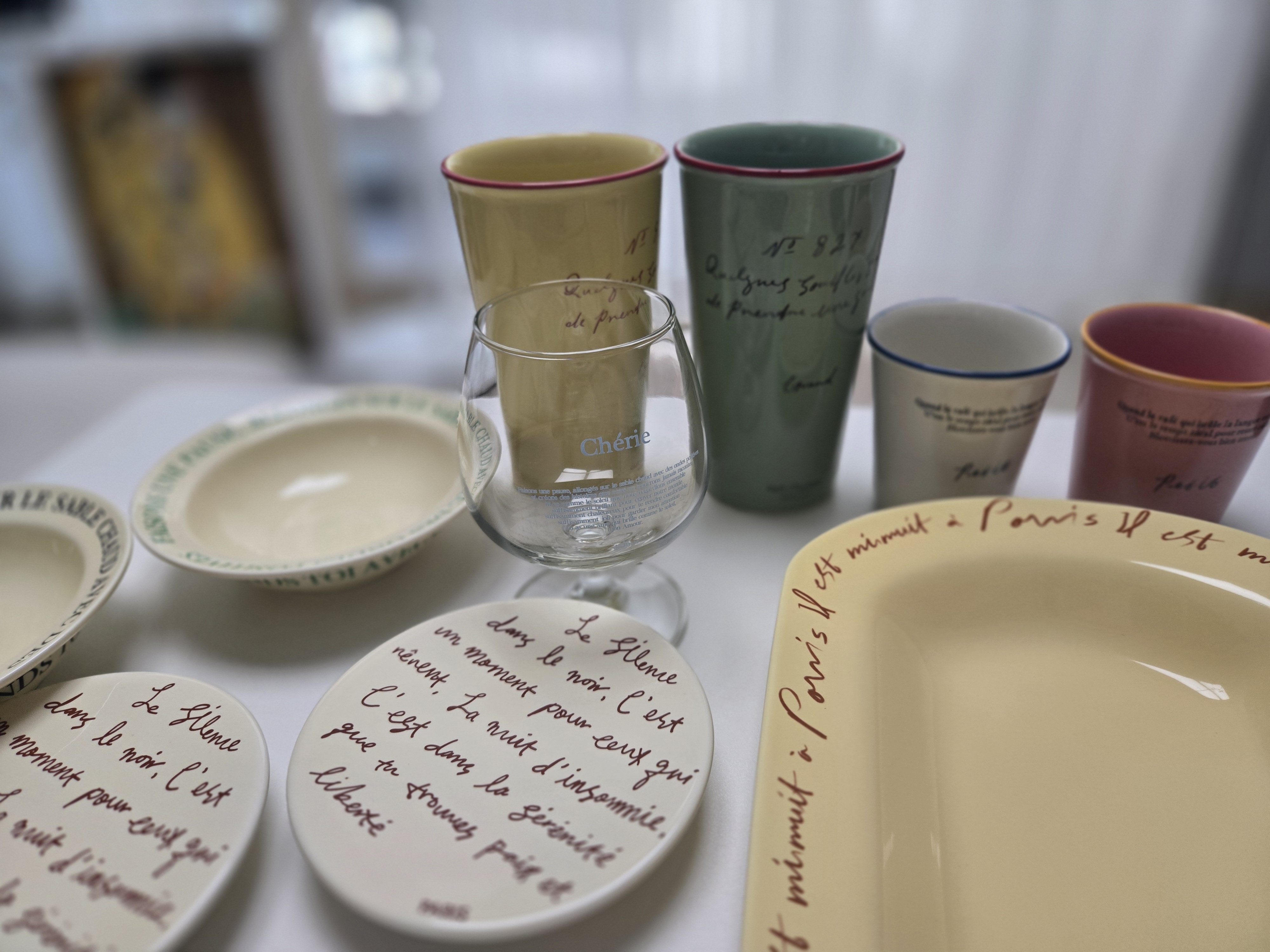 각각의 컵에는 프랑스어로 문구가 적혀있어요.