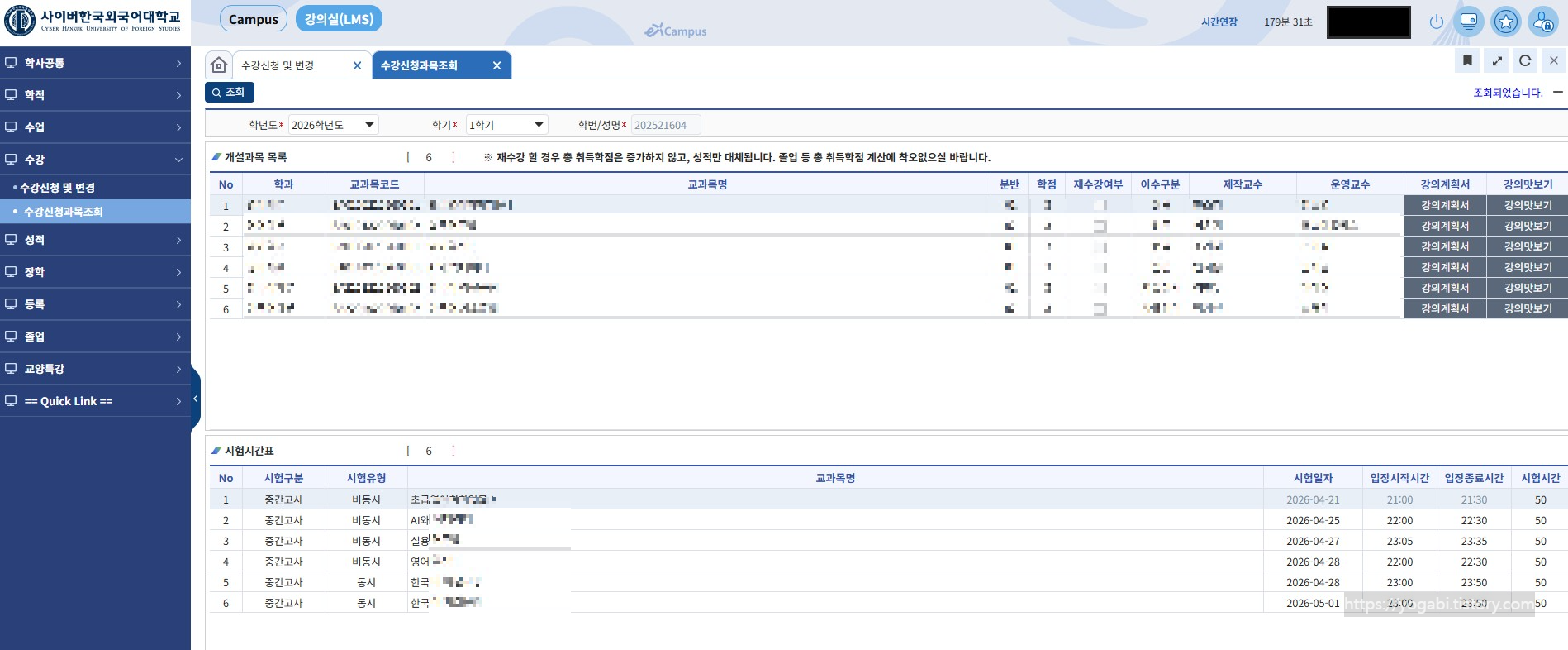 CAMPUS > 수강 > 수강신청과목조회 > 시험시간표